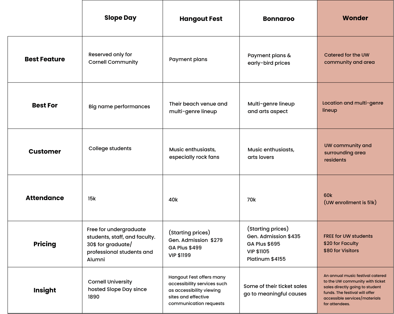 To better understand how my festival could differentiate itself, I compared these festivals in a competitive analysis chart. This helped highlight common offerings, signature features, branding styles, and experience gaps that Wonder could address.
