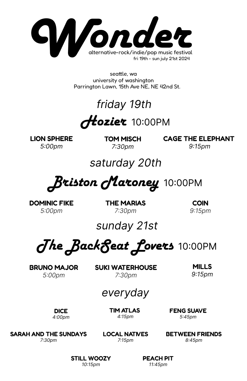 Wonder is a annual 3 day, end-of-the-year music festival located at the University of Washington consisting of a selection of genres: alternative-rock, indie, and pop. The idea behind this is to provide a multi-day festival with popular up-and-coming artists in these genres to perform. Unlike other music festivals, Wonder provides the UW community a fun, affordable weekend through low prices and guaranteed admission as a UW student.