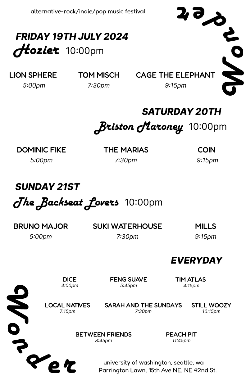 I designed Wonder, a multi-genre music festival tailored to the interests and needs of UW students. Drawing from insights gathered through student research, I created a cohesive visual identity that reflects the festival’s energy while remaining accessible and easy to navigate. This visual system was applied across promotional materials—such as posters, signage, and a mobile app—to ensure a consistent and compelling brand experience.